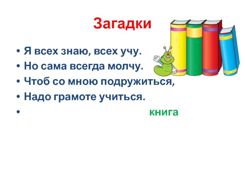 Загадки Я всех знаю, всех учу.Но сама всегда молчу.Чтоб со мною подружиться,Надо грамоте учиться.