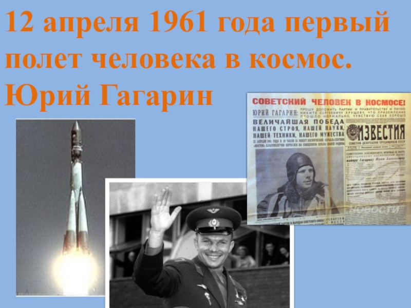 12 апреля 1961 года первый полет человека в космос.Юрий Гагарин
