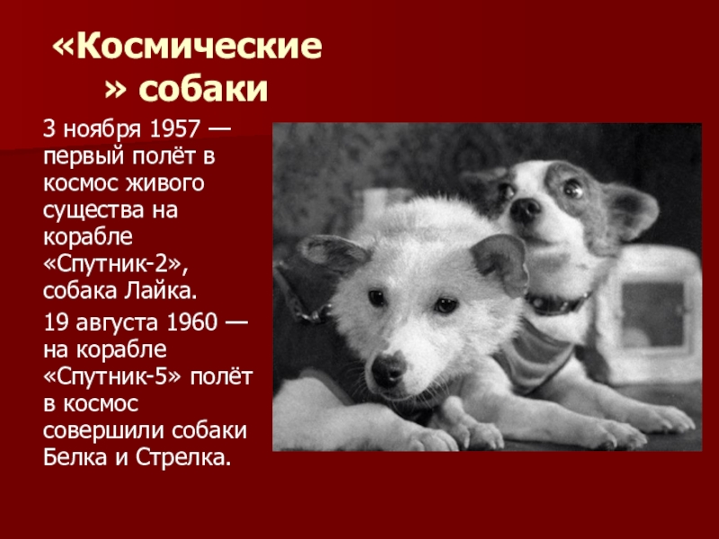 «Космические» собаки3 ноября 1957 — первый полёт в космос живого существа на корабле «Спутник-2», собака Лайка.19 августа