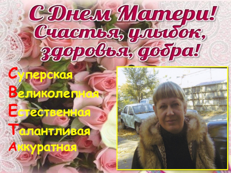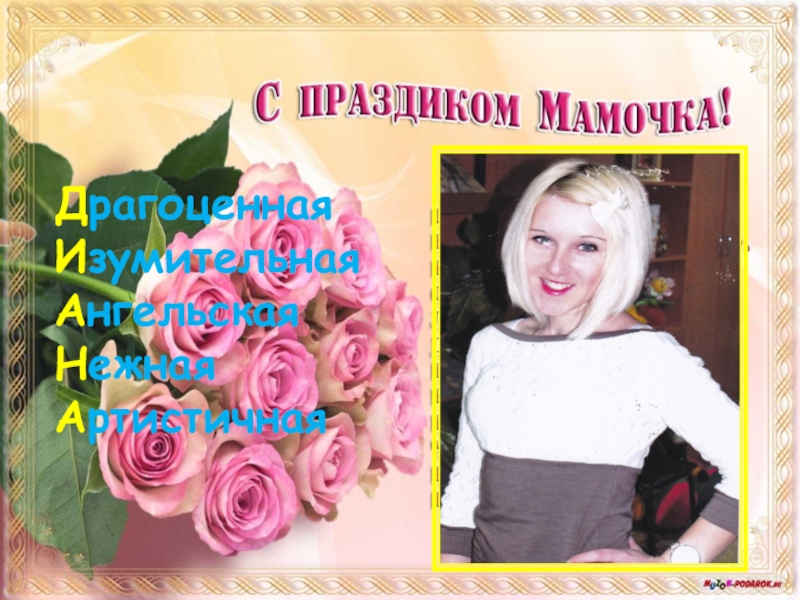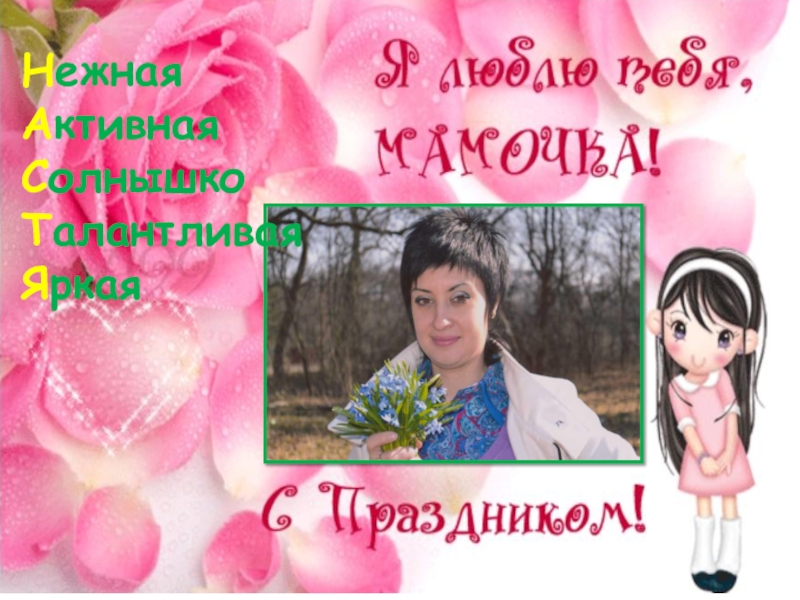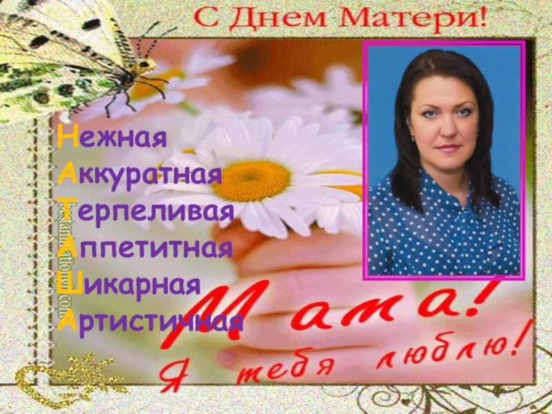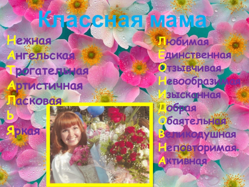 Классная мамаНежная Ангельская Трогательная Артистичная ЛасковаяЬЯркаяЛюбимаяЕдинственнаяОтзывчиваяНевообразимая Изысканная Добрая ОбаятельнаяВеликодушнаяНеповторимаяАктивная