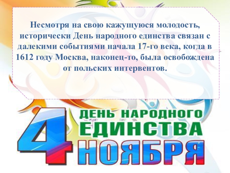 Слайд 4Несмотря на свою кажущуюся молодость, исторически День народного единства связан с