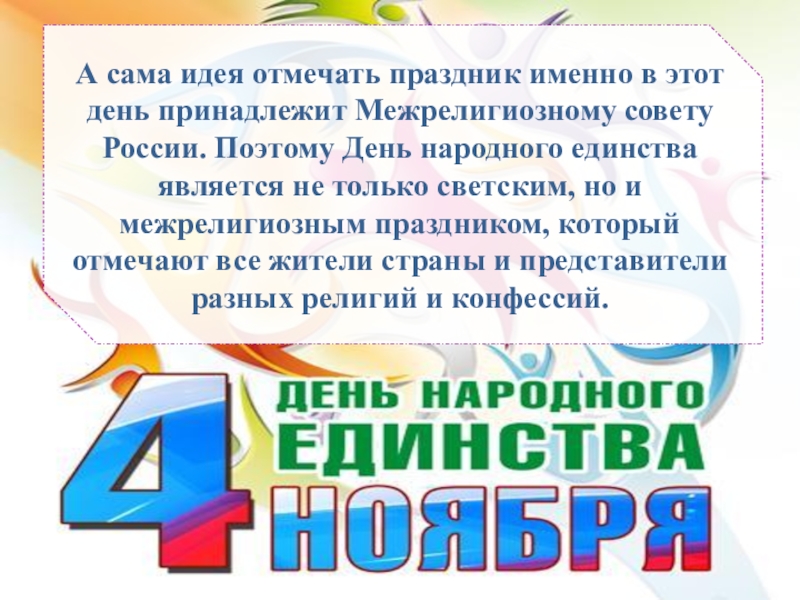 совету России. Поэтому День народного единства является не только светским, но и межрелигиозным праздником, который отмечают все жители страны и представители разных религий и конфессий.