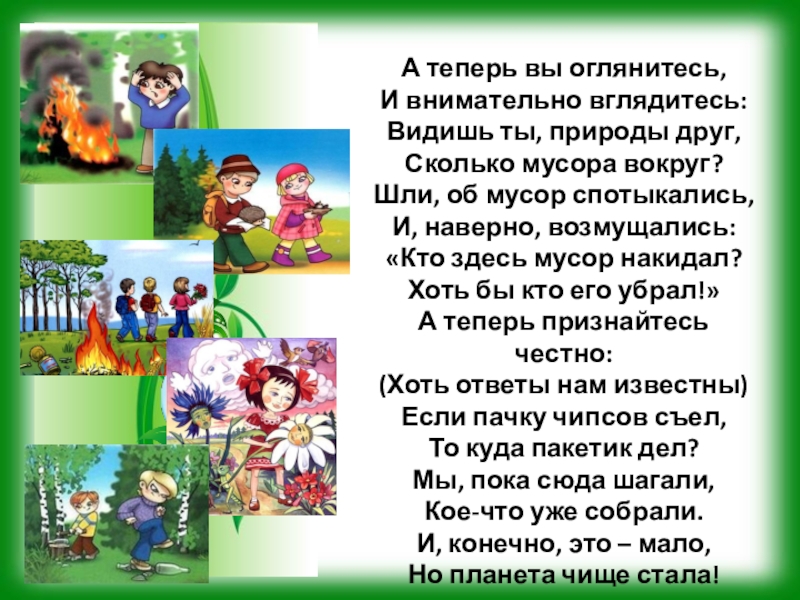 А теперь вы оглянитесь,И внимательно вглядитесь:Видишь ты, природы друг,Сколько мусора вокруг?Шли, об мусор спотыкались,И, наверно, возмущались:«Кто здесь