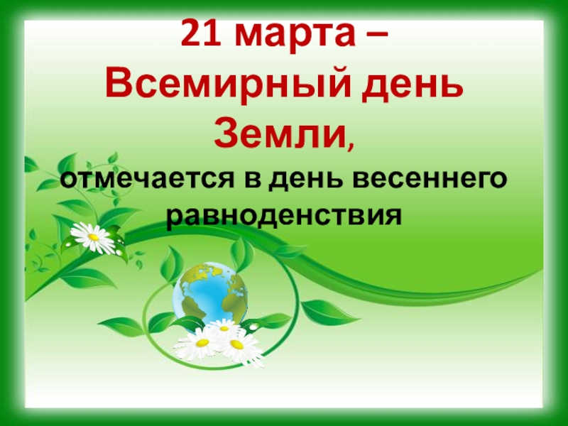 Слайд 821 марта – Всемирный день Земли, отмечается в день весеннего равноденствия