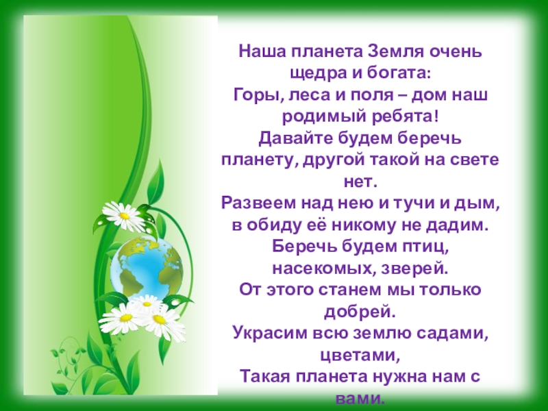 Есть чудеса на белом свете,Цветёт, как мак, заря вдали.На голубой своей планетеВстречают люди День Земли!Мы не гости на планете,И земля – наш дом.Будет в нём светло и чисто,Если мы спасём:И прозрачные озёра,И кедровый бор,И цветных полей
