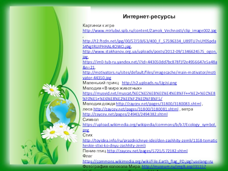 Интернет-ресурсыКартинки к игре http://www.mirlubvi.spb.ru/content/Zamok_Vechnosti/clip_image002.jpg, http://t2.ftcdn.net/jpg/00/57/59/63/400_F_57596334_U89TU7nUY0SpdaS4NgtRUIPHHAL4OWCi.jpg, http://www.stakhanov.org.ua/uploads/posts/2012-09/1346624575_ogon.jpg, https://im0-tub-ru.yandex.net/i?id=443050dd7bc878f1f2e4956647e5a48a&n=21, http://motivators.ru/sites/default/files/imagecache/main-motivator/motivator-44350.jpg Маленький принц  http://s2.uploads.ru/UgJsi.pngМелодия «В мире животных» https://musvid.net/muscat/%EC%E5%EB%EE%E4%E8%FF++%E2+%EC%E8%F0%E5+%E6%E8%E2%EE%F2%ED%FB%F5/ Мелодия