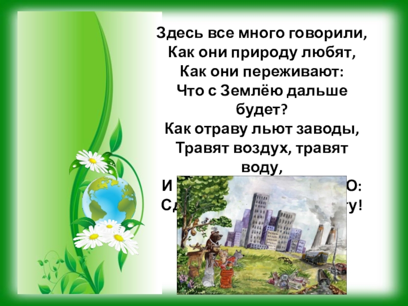 Здесь все много говорили,Как они природу любят,Как они переживают:Что с Землёю дальше будет?Как отраву льют заводы,Травят воздух,