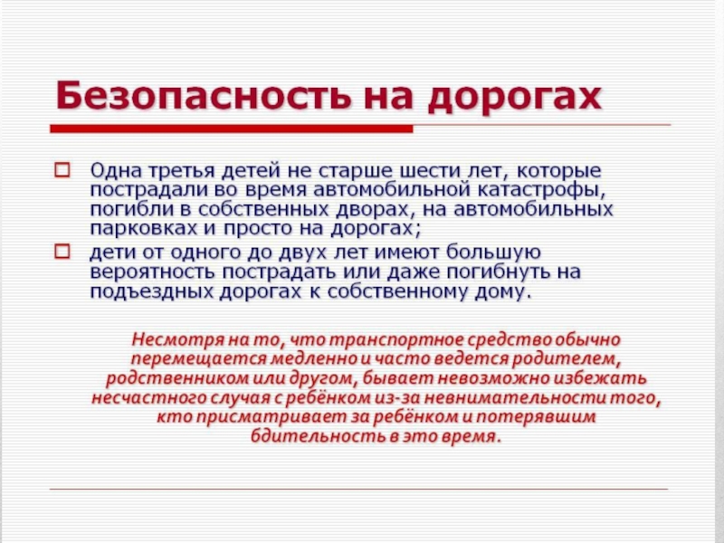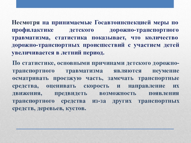 По статистике, основными причинами детского дорожно-транспортного травматизма являются неумение осматривать проезжую часть, замечать транспортные средства, оценивать скорость и направление их движения, предвидеть возможность появления транспортного средства из-за других транспортных средств, деревьев, кустов.