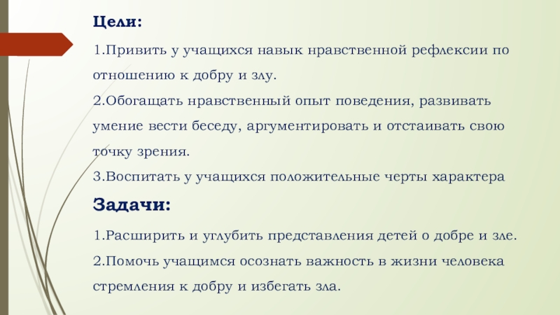 1.Привить у учащихся навык нравственной рефлексии по отношению к добру и