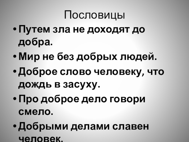 Пословицы Путем зла не доходят до добра.Мир не без добрых людей.Доброе слово человеку, что дождь в засуху.Про