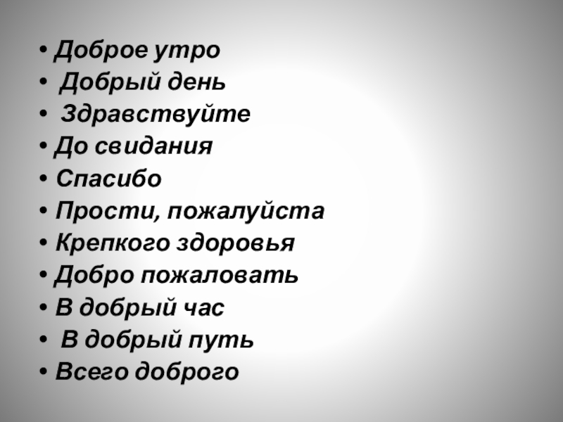 Доброе утро Добрый день Здравствуйте До свидания Спасибо Прости, пожалуйстаКрепкого здоровья Добро пожаловатьВ добрый час В добрый