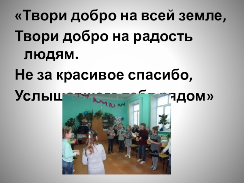 «Твори добро на всей земле, Твори добро на радость людям.Не за красивое спасибо,Услышавшего тебя рядом»