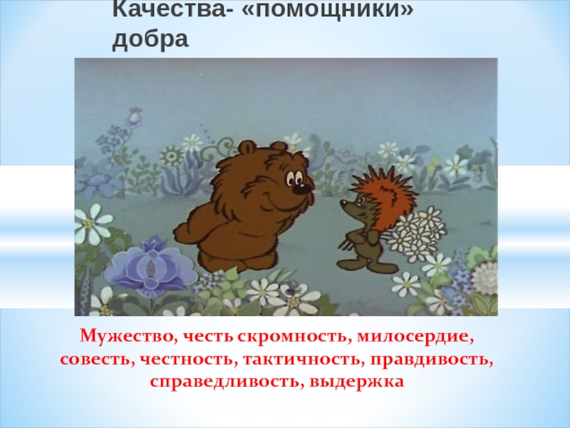 Качества человека: мужество, честь, хвастливость, жестокость, скромность, милосердие, совесть, трусость, зависть, жадность, честность, тактичность, болтливость, правдивость, хитрость, бестактность, лживость, справедливость, выдержка, эгоизм.