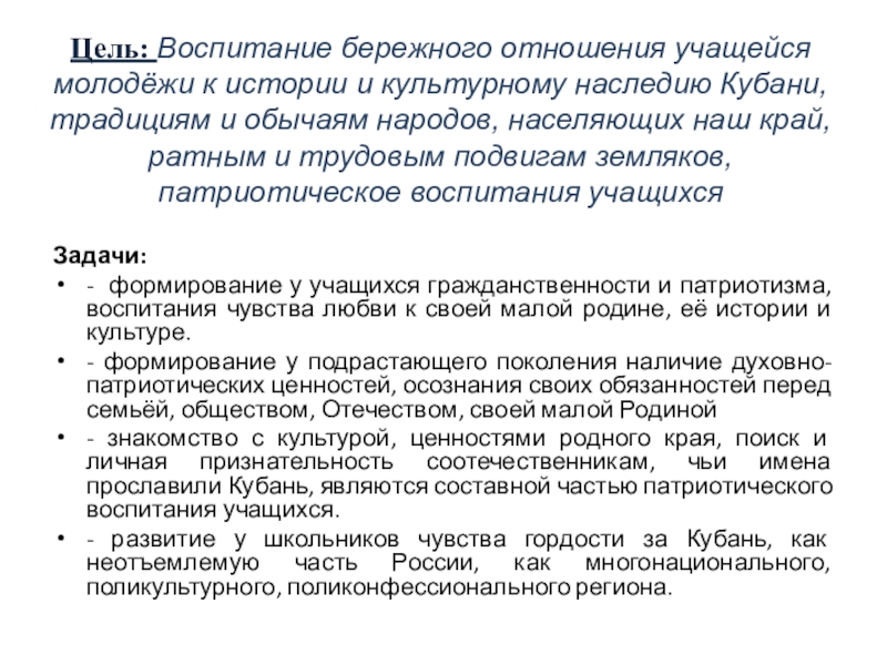 - развитие у школьников чувства гордости за Кубань, как неотъемлемую часть России, как многонационального, поликультурного, поликонфессионального региона.