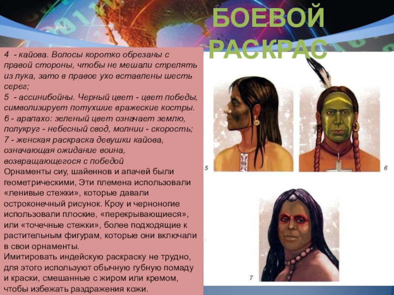 Имитировать индейскую раскраску не трудно, для этого используют обычную губную помаду и краски, смешанные с жиром или кремом, чтобы избежать раздражения кожи.