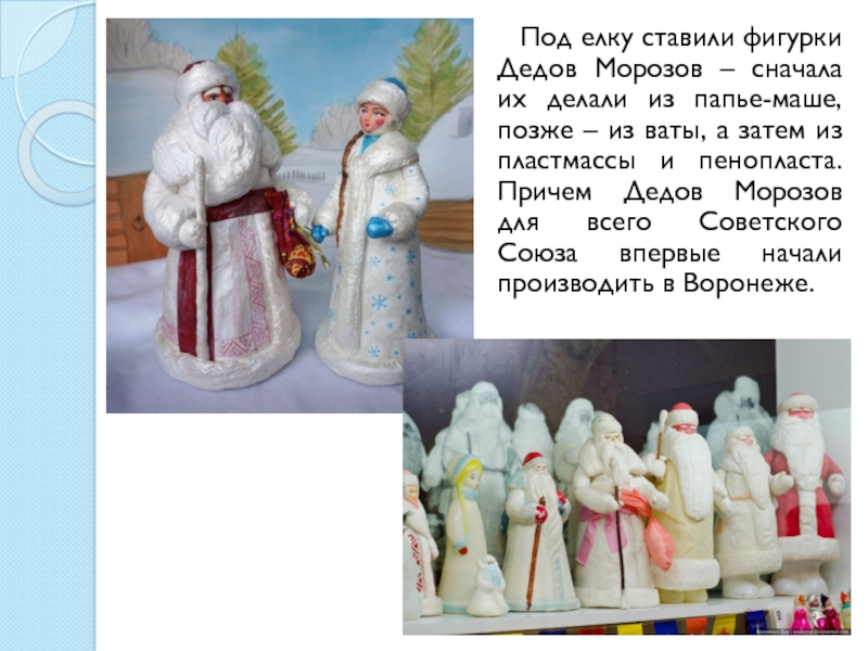 Слайд 8 Под елку ставили фигурки Дедов Морозов – сначала