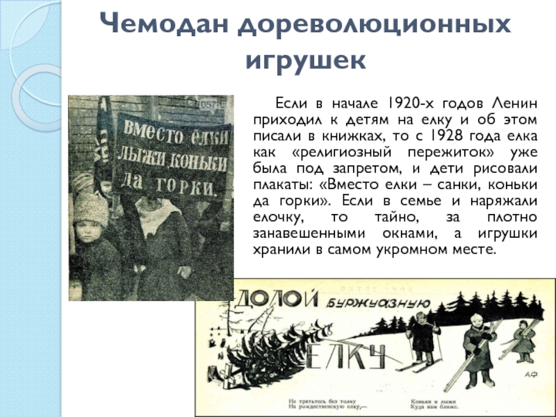 приходил к детям на елку и об этом писали в книжках, то с 1928 года елка как «религиозный пережиток» уже была под запретом, и дети рисовали плакаты: «Вместо елки – санки, коньки да горки». Если в семье и наряжали елочку, то тайно, за плотно занавешенными окнами, а игрушки хранили в самом укромном месте.