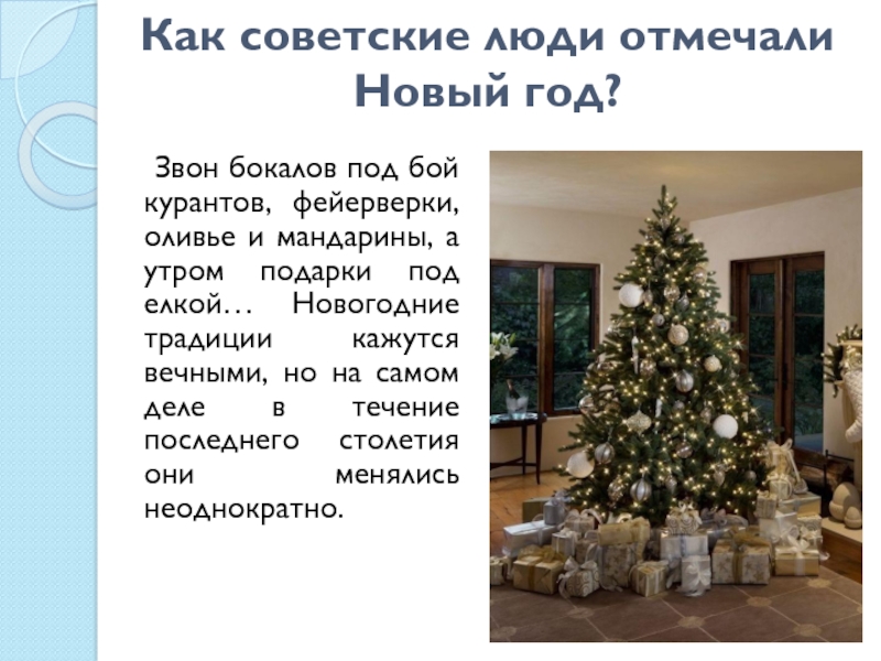 курантов, фейерверки, оливье и мандарины, а утром подарки под елкой… Новогодние традиции кажутся вечными, но на самом деле в течение последнего столетия они менялись неоднократно.