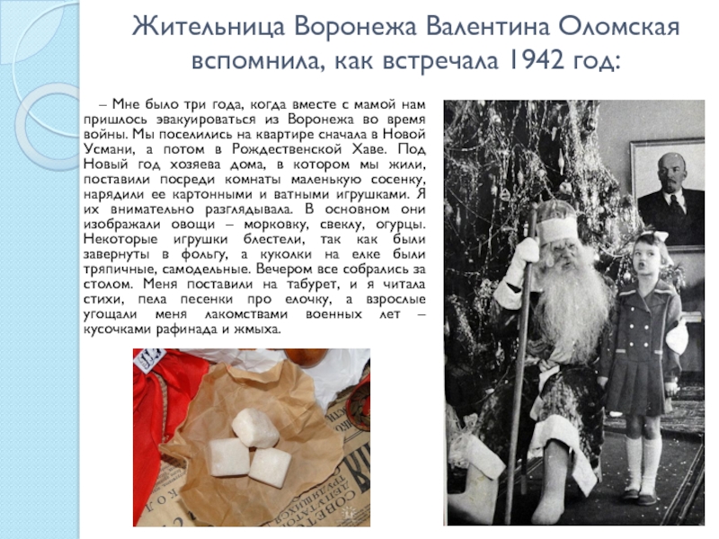 Слайд 6Жительница Воронежа Валентина Оломская вспомнила, как встречала 1942 год: