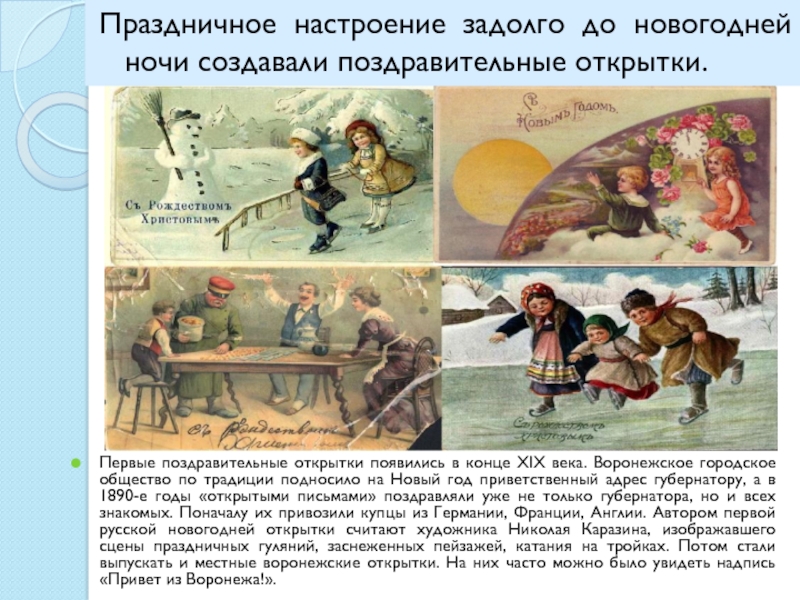 появились в конце XIX века. Воронежское городское общество по традиции подносило на Новый год приветственный адрес губернатору, а в 1890-е годы «открытыми письмами» поздравляли уже не только губернатора, но и всех знакомых. Поначалу их привозили купцы из Германии, Франции, Англии. Автором первой русской новогодней открытки считают художника Николая Каразина, изображавшего сцены праздничных гуляний, заснеженных пейзажей, катания на тройках. Потом стали выпускать и местные воронежские открытки. На них часто можно было увидеть надпись «Привет из Воронежа!».