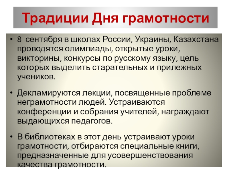 В библиотеках в этот день устраивают уроки грамотности, отбираются специальные книги, предназначенные для усовершенствования качества грамотности.