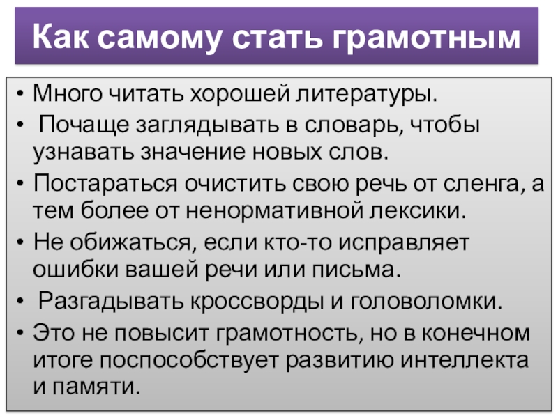 Слайд 11Никогда не стоит забывать о собственной грамотности, всегда необходимо ее повышать.