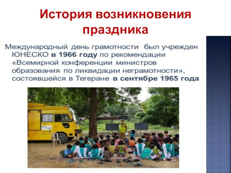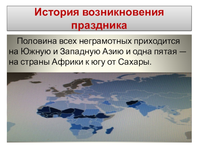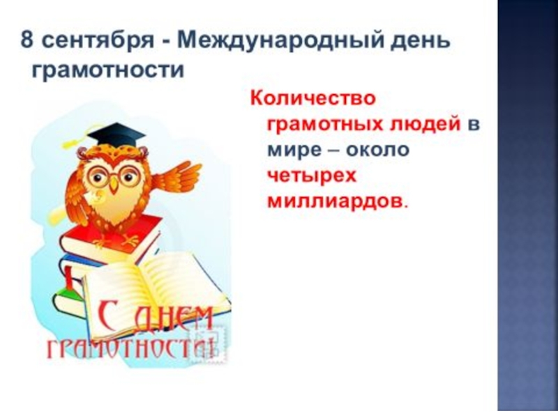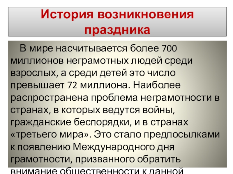 людей среди взрослых, а среди детей это число превышает 72 миллиона. Наиболее распространена проблема неграмотности в странах, в которых ведутся войны, гражданские беспорядки, и в странах «третьего мира». Это стало предпосылками к появлению Международного дня грамотности, призванного обратить внимание общественности к данной проблеме.