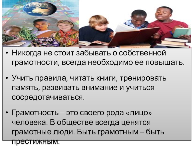 Грамотность – это своего рода «лицо» человека. В обществе всегда ценятся грамотные люди. Быть грамотным – быть престижным.