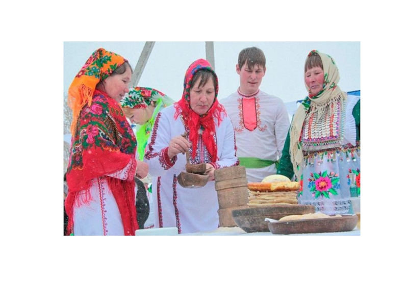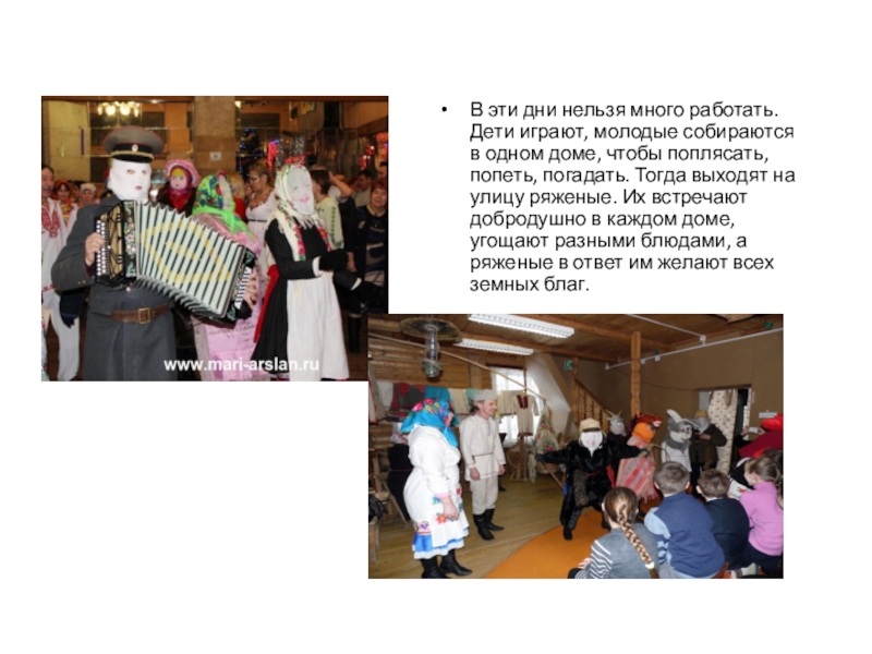 одном доме, чтобы поплясать, попеть, погадать. Тогда выходят на улицу ряженые. Их встречают добродушно в каждом доме, угощают разными блюдами, а ряженые в ответ им желают всех земных благ.