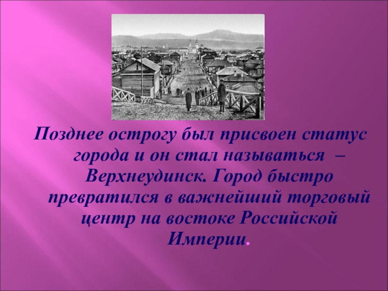 Позднее острогу был присвоен статус города и он стал называться – Верхнеудинск. Город быстро превратился в важнейший
