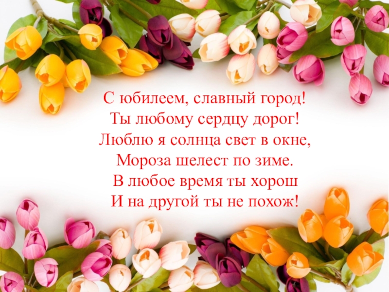 С юбилеем, славный город!Ты любому сердцу дорог!Люблю я солнца свет в окне,Мороза шелест по зиме.В любое время