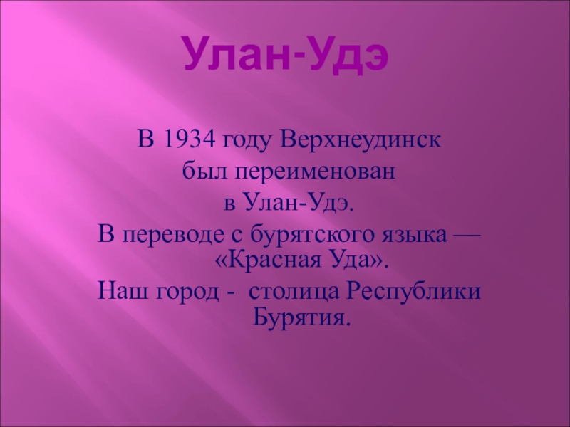 Улан-УдэВ 1934 году Верхнеудинск был переименован в Улан-Удэ. В переводе с бурятского языка — «Красная Уда».Наш город