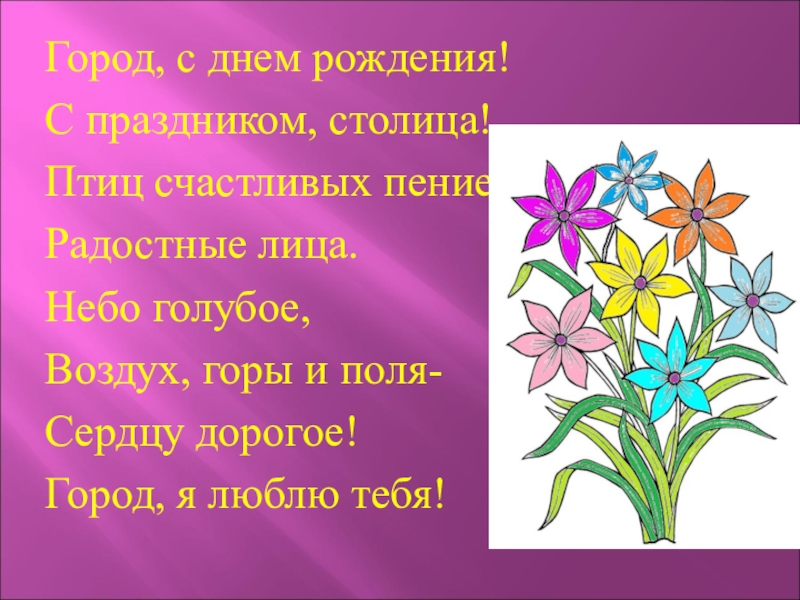 Город, с днем рождения!С праздником, столица!Птиц счастливых пение,Радостные лица.Небо голубое,Воздух, горы и поля-Сердцу дорогое!Город, я люблю тебя!
