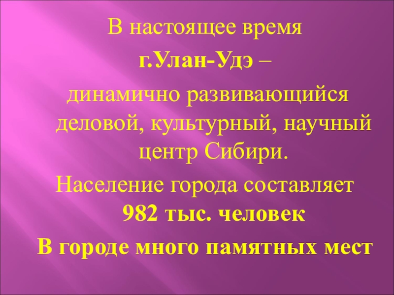В настоящее время г.Улан-Удэ – динамично развивающийся деловой, культурный, научный центр Сибири. Население города составляет 982 тыс.