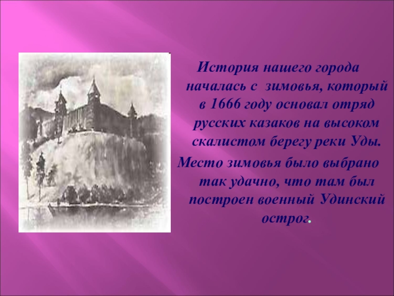 Уды и начинался с казачьего зимовья (17 век). Место для города было выбрано казаками и называлось « Заудинским камушком».