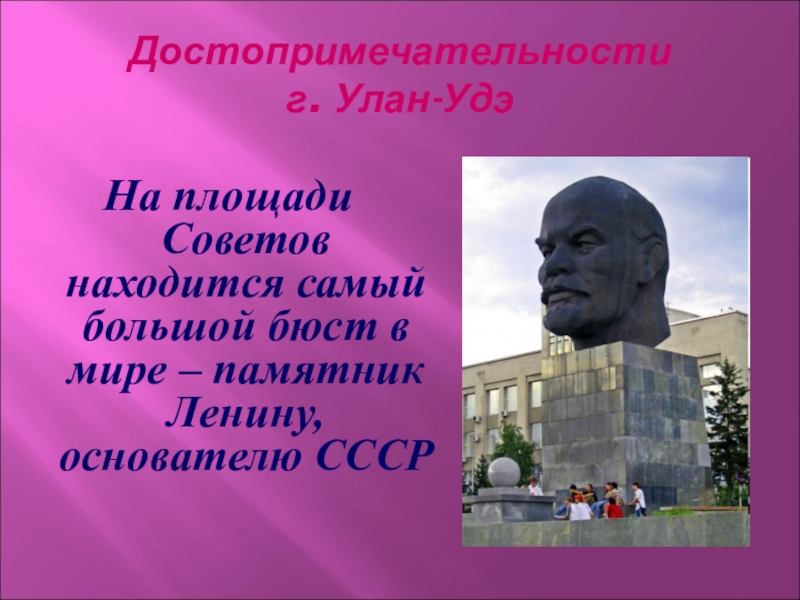 Достопримечательности  г. Улан-Удэ   На площади Советов находится самый большой бюст в мире – памятник