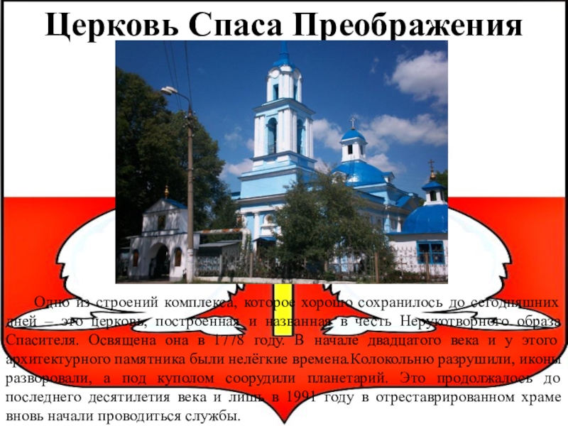 сохранилось до сегодняшних дней – это церковь, построенная и названная в честь Нерукотворного образа Спасителя. Освящена она в 1778 году. В начале двадцатого века и у этого архитектурного памятника были нелёгкие времена.Колокольню разрушили, иконы разворовали, а под куполом соорудили планетарий. Это продолжалось до последнего десятилетия века и лишь в 1991 году в отреставрированном храме вновь начали проводиться службы.