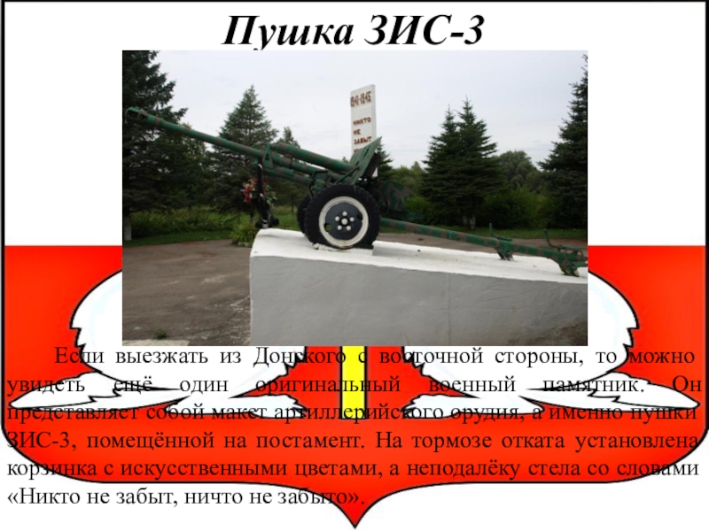 то можно увидеть ещё один оригинальный военный памятник. Он представляет собой макет артиллерийского орудия, а именно пушки ЗИС-3, помещённой на постамент. На тормозе отката установлена корзинка с искусственными цветами, а неподалёку стела со словами «Никто не забыт, ничто не забыто».