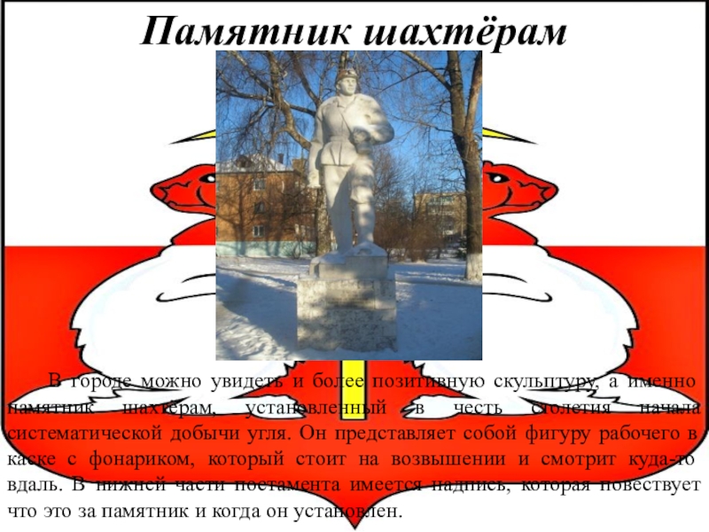 более позитивную скульптуру, а именно памятник шахтёрам, установленный в честь столетия начала систематической добычи угля. Он представляет собой фигуру рабочего в каске с фонариком, который стоит на возвышении и смотрит куда-то вдаль. В нижней части постамента имеется надпись, которая повествует что это за памятник и когда он установлен.