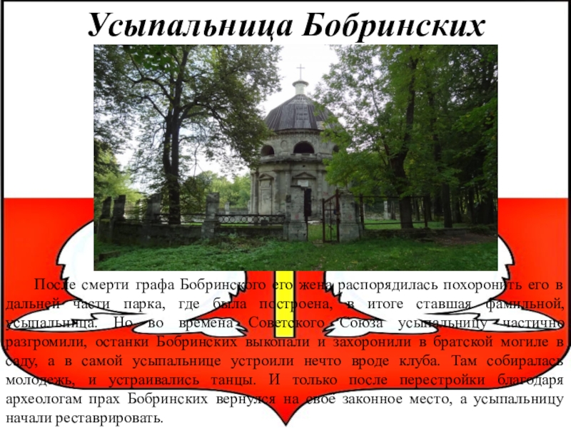 похоронить его в дальней части парка, где была построена, в итоге ставшая фамильной, усыпальница. Но во времена Советского Союза усыпальницу частично разгромили, останки Бобринских выкопали и захоронили в братской могиле в саду, а в самой усыпальнице устроили нечто вроде клуба. Там собиралась молодежь, и устраивались танцы. И только после перестройки благодаря археологам прах Бобринских вернулся на своё законное место, а усыпальницу начали реставрировать.