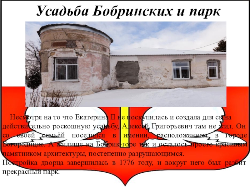 действительно роскошную усадьбу, Алексей Григорьевич там не жил. Он со своей семьёй поселился в имении, расположенном в городе Богородицке. А жилище на Бобрик-горе так и осталось просто красивым памятником архитектуры, постепенно разрушающимся.