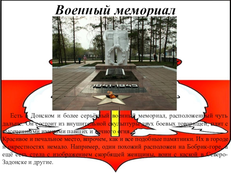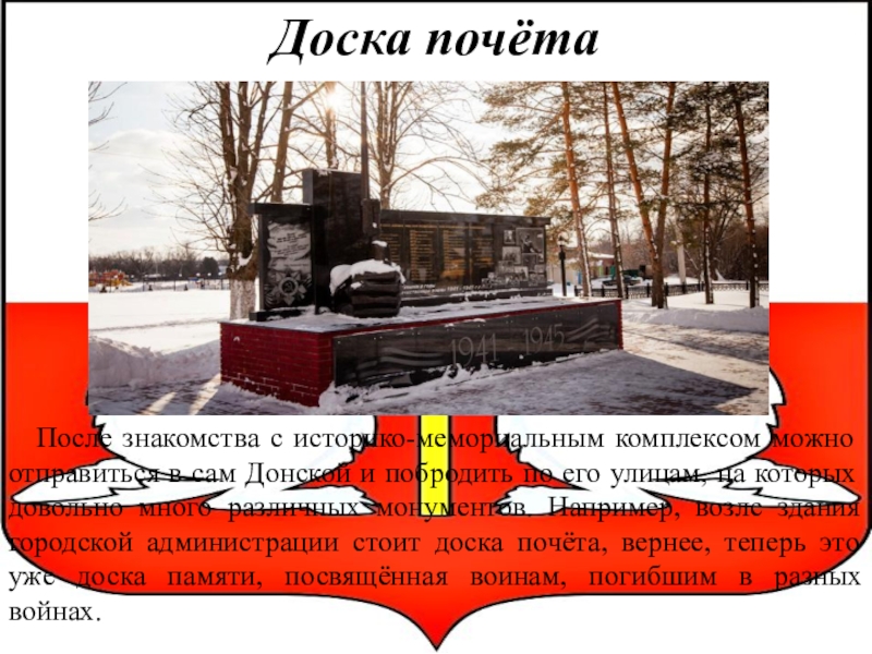 сам Донской и побродить по его улицам, на которых довольно много различных монументов. Например, возле здания городской администрации стоит доска почёта, вернее, теперь это уже доска памяти, посвящённая воинам, погибшим в разных войнах.