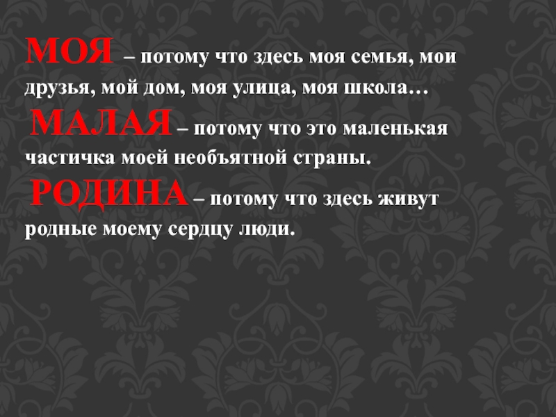 МОЯ – потому что здесь моя семья, мои друзья, мой дом, моя улица, моя школа… МАЛАЯ –