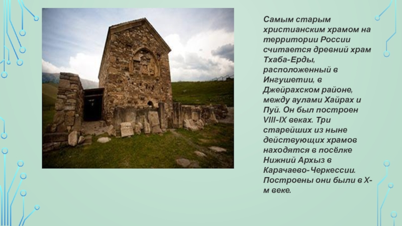 Слайд 9Самым старым христианским храмом на территории России считается древний храм Тхаба-Ерды,