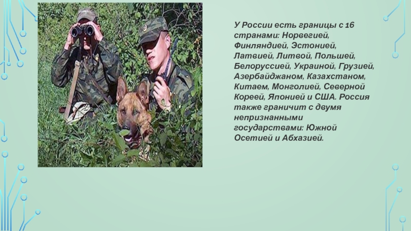 Слайд 13У России есть границы с 16 странами: Норвегией, Финляндией, Эстонией, Латвией,