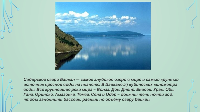 крупный источник пресной воды на планете. В Байкале 23 кубических километра воды. Все крупнейшие реки мира – Волга, Дон, Днепр, Енисей, Урал, Обь, Ганг, Ориноко, Амазонка, Темза, Сена и Одер – должны течь почти год, чтобы заполнить бассейн, равный по объёму озеру Байкал.