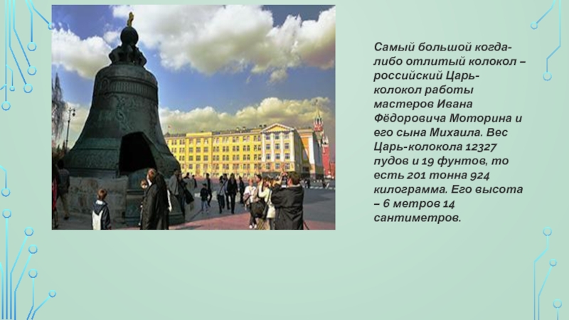 Фёдоровича Моторина и его сына Михаила. Вес Царь-колокола 12327 пудов и 19 фунтов, то есть 201 тонна 924 килограмма. Его высота – 6 метров 14 сантиметров.
