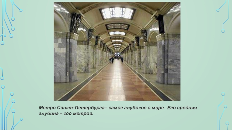 Слайд 7Метро Санкт-Петербурга– самое глубокое в мире. Его средняя глубина – 100