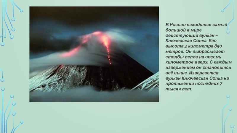 Сопка. Его высота 4 километра 850 метров. Он выбрасывает столбы пепла на восемь километров вверх. С каждым извержением он становится всё выше. Извергается вулкан Ключевская Сопка на протяжении последних 7 тысяч лет.