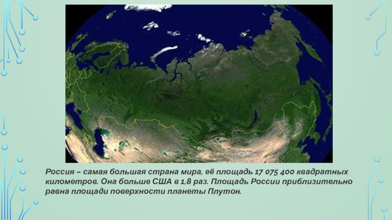 квадратных километров. Она больше США в 1,8 раз. Площадь России приблизительно равна площади поверхности планеты Плутон.